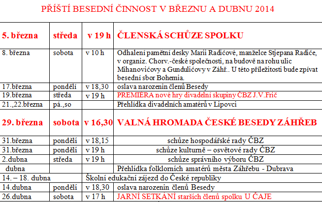 ČESKÁ BESEDA ZÁHŘEB Šubićova 20, tel/fax: 385 1 46 55 306 |